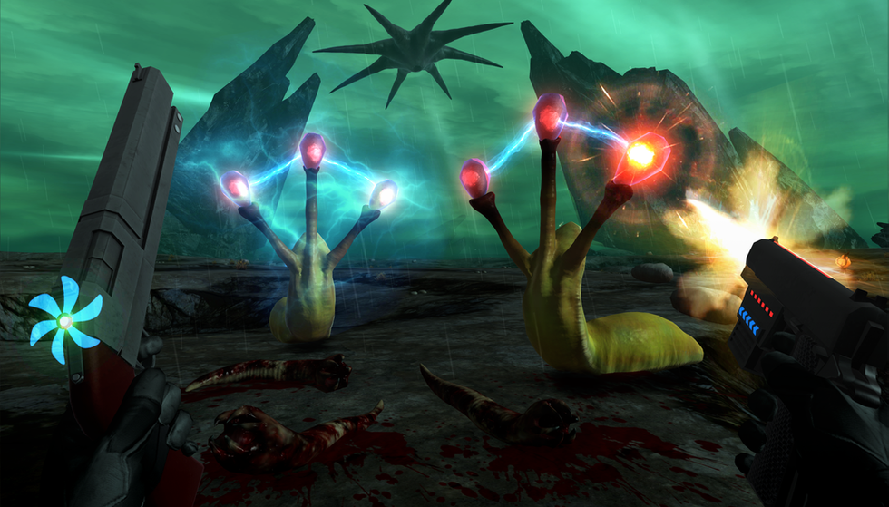 You will need to master your pistol, boomstick, scanner and teleporter to survive. New firing modes and powerups will drop during missions. By gaining XP you can level up, unlock perks, and radically alter how the game plays.